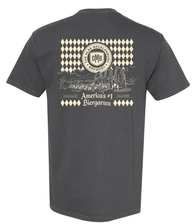 This unisex OMB Biergarten t-shirt is screen printed on a super soft Comfort Colors crew neck t-shirt making it the ultimate relaxing tee. It features our OMB shield logo on the front and our biergarten illustration on the back.