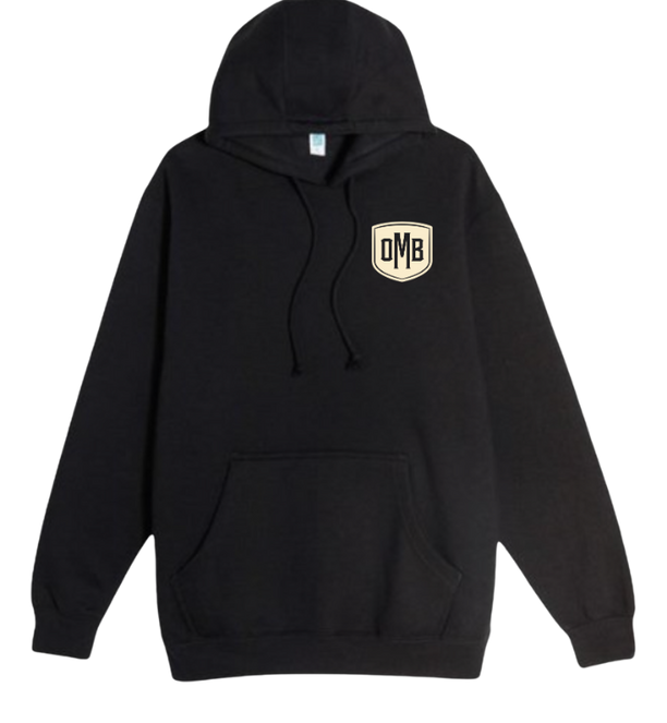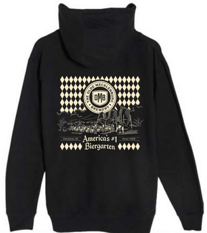 This unisex OMB Biergarten black hoodie is screen printed on a super soft Lane Seven black hoodie making it the ultimate cozy sweatshirt. It features our OMB shield logo on the front and our biergarten illustration on the back.